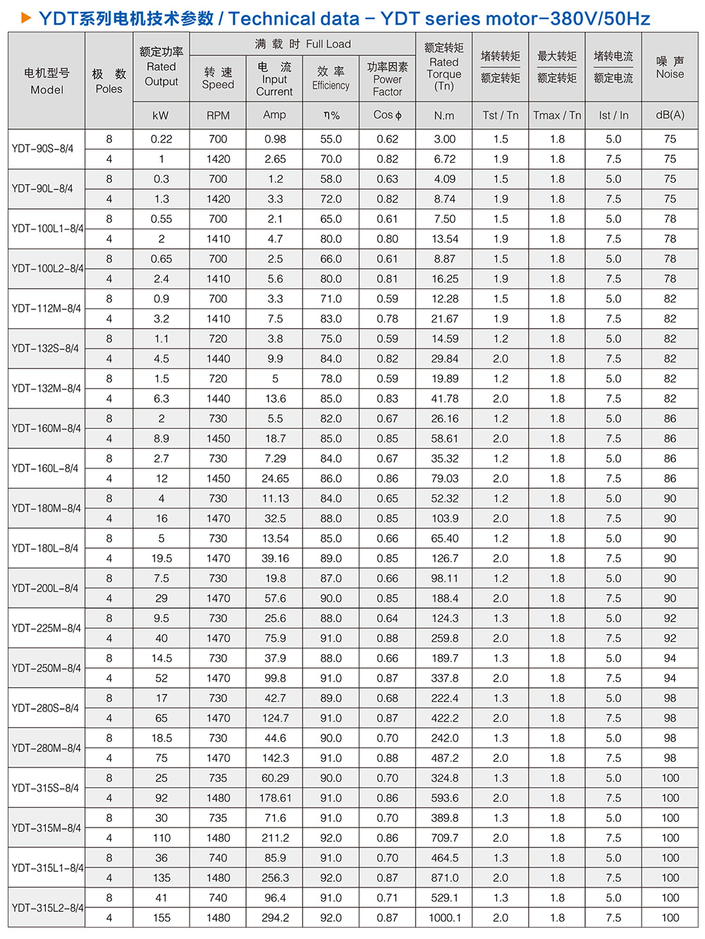 Thông số kỹ thuật động cơ YDT280M1-8/6